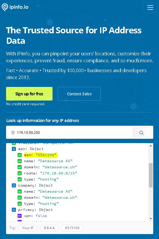 Como se vê, existe apenas a opção de digitar o número do sistema autônomo, e encontrar os dados de nome e tipo. Usei o ASN da Datasource AG obtido pelo IP 176.10.99.200 anteriormente, como exemplo: