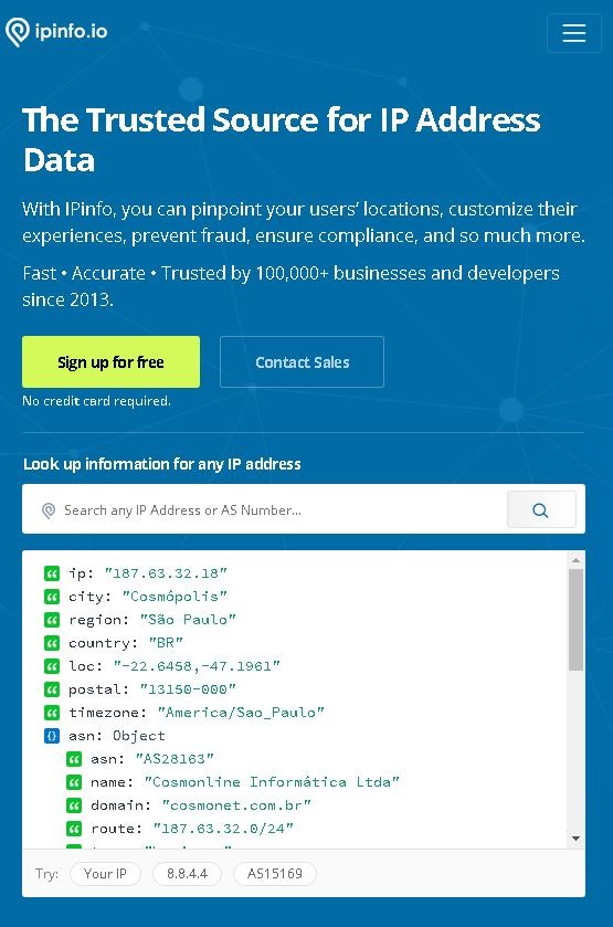 Ao entrar no site https://ipinfo.io encontramos um conjunto de ferramentas com o intuito de identificar a localização de seus usuários. O https://ifconfig.me, sitio virtual que o recomenda, também tem essa função. Porém, nesse sitio encontramos o endereço do nosso ponto de acesso com as descrições detalhadas de uma maneira bem mais legível por humanos (…)