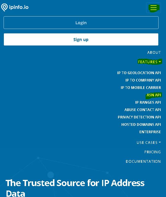 Ao clicar no ícone de menus, depois em FEATURES, no canto superior direito você consegue verificar quais são as ferramentas disponíveis pelo https://ipinfo.io . São elas: