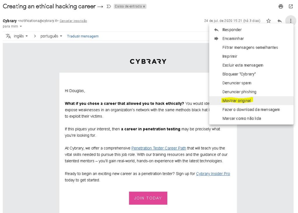 No campo paste email letter header você deve copiar o cabeçalho do e-mail a ser investigado. Por fins didáticos, abri um e-mail que recebi (servidor Gmail) para explicar como obter o cabeçalho: