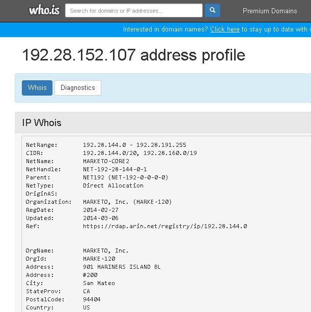 Fiz uma pesquisa no sitio https://who.is digitando o endereço IP 192.28.152.107, referente ao remetente do exemplo. Copiei o resultado para que possa comparar o mecanismo online com a forma apresentada na postagem anterior: