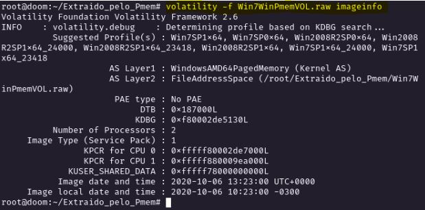 No diretório onde se encontra a imagem da memória, digitei o comando volatility –f Win7WinPmemVOL.raw imageinfo, sendo que Win7WinPmemVOL.raw é o nome que dei ao arquivo de imagem.
