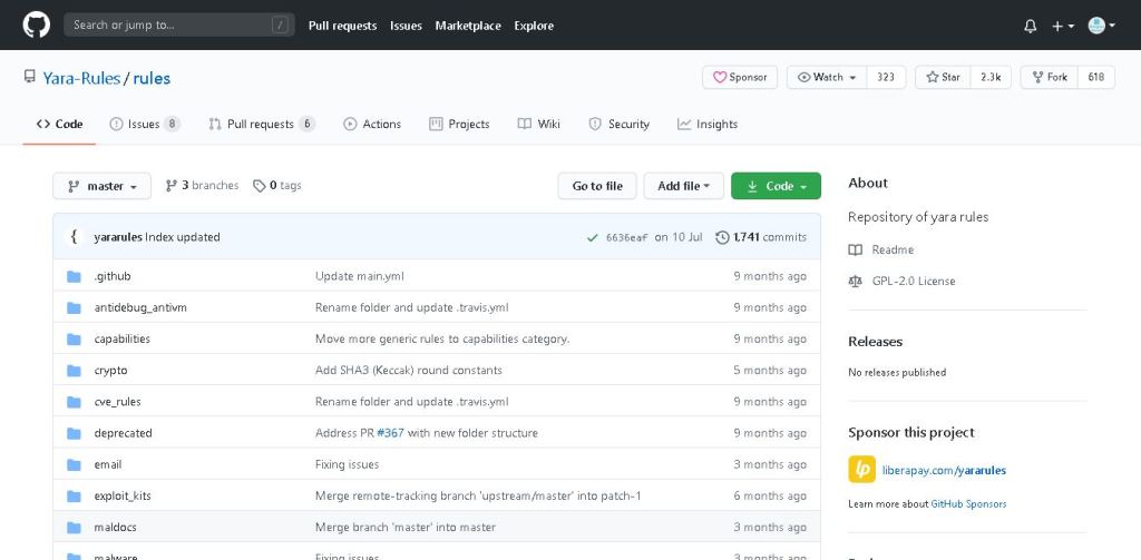Você pode clonar o repositório, ou baixar os arquivos que deseja. No meu caso, fiz a clonagem no diretório /root e renomeei para yara_rules.