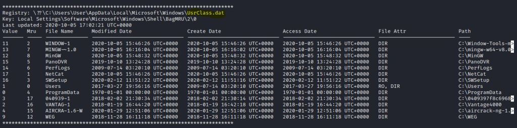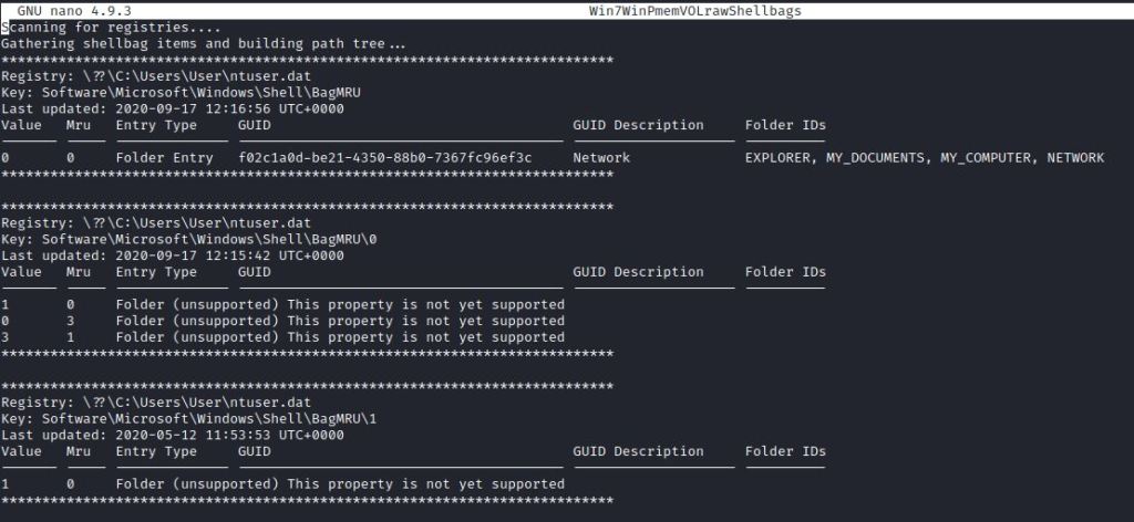 Agora, imagine que uma pessoa mal-intencionada acessou diretórios protegidos incompatibilizando com suas permissões de usuário. Vasculharemos se houve esse ocorrido com o plug-in shellbags, enviando seus resultados para um arquivo de saída. Utilizo dessa vez o próprio STDOUT do Linux.