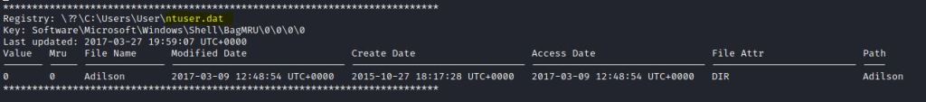 … e verifico que o resultado possui informações de acesso e modificações realizadas pelo usuário dessa máquina. Como o plug-in está relacionado aos registros do Windows, acesso a diretórios, conexões realizadas pela internet, acesso a arquivos, ou seja, um histórico de eventos ocorridos, realizando o processo de extração e análise de imagem de memória posso “cruzar” informações com as informações obtidas pela ferramenta RegRipper, já explicado aqui nesse blog. Caso não conheça a postagem, segue link: