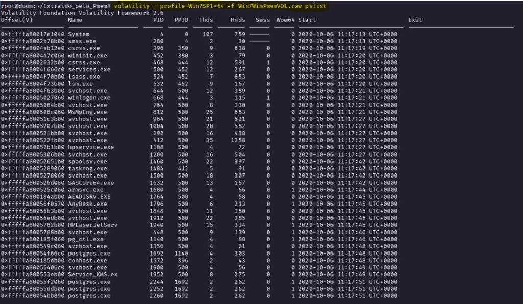 A primeira coisa que devemos fazer é enumerar os processos ativos que estavam sendo executados no destino quando adquirimos a imagem da memória. Para fazer isso, podemos usar o plug-in pslist. Para isso digite o comando volatility –profile={PERFIL_ESCOLHIDO} –f {NOME_DO_ARQUIVO} pslist