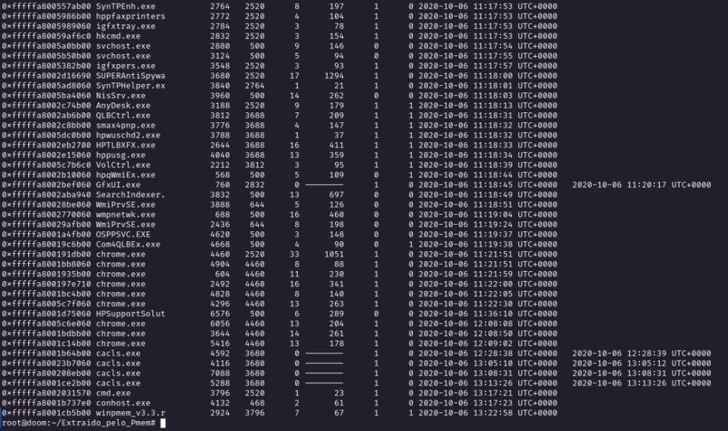 Também processos ocultos ou encerrados podem ser enumerados com o plug-in psscan. Na imagem que extraí não encontrei nenhum.