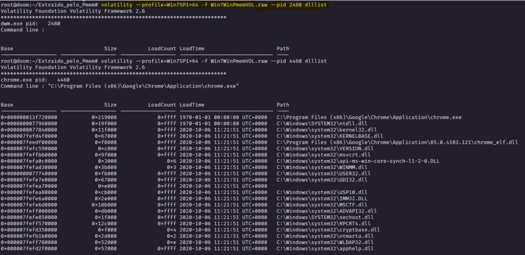 O plug-in dlllist exibe todas as DLL’s referenciadas por todos os processos. Uma boa prática seria restringir a pesquisa especificando a opção pid, devido a vasta quantidade que normalmente encontrará de processos. Então, o comando a ser aplicado: