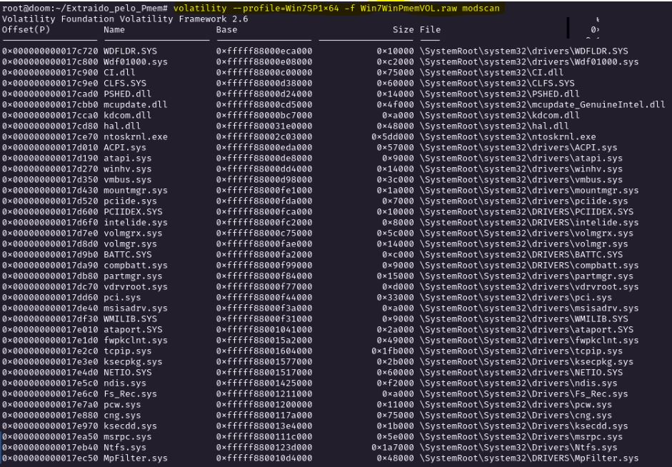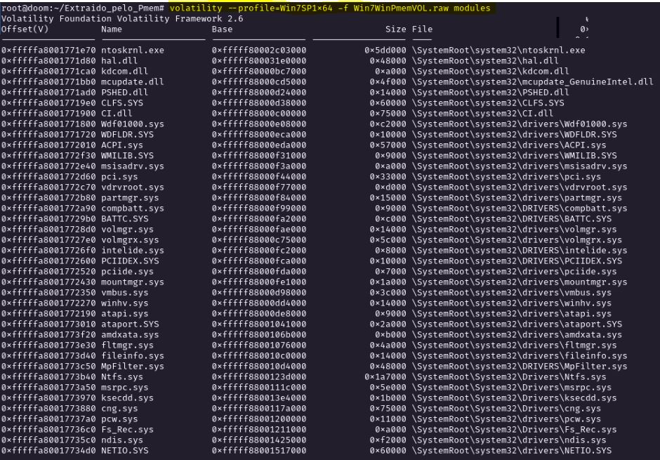 Assim o Volatility gera todas as DLL’s relativas aos processos específicos. Para exibir os módulos e drivers do kernel, usamos o plug-in modules.