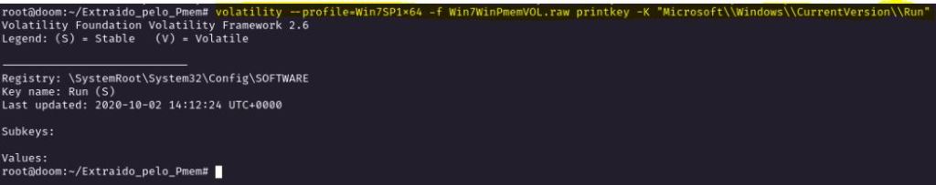 volatility –profile={PERFIL_ESCOLHIDO} –f {NOME_DO_ARQUIVO} printkey –K “Microsoft\\Windows\\CurrentVersion\\Run”