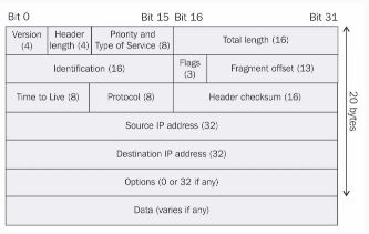 O principal protocolo da camada de rede é o Internet Protocol (ou IP) cuja versão 4 ainda é a mais utilizada. O protocolo IP executa as funções de endereçamento e roteamento de pacotes. Os campos principais do cabeçalho IP são os campos de endereço de origem e destino. Existem 32 bits cada, como podemos ver neste diagrama.