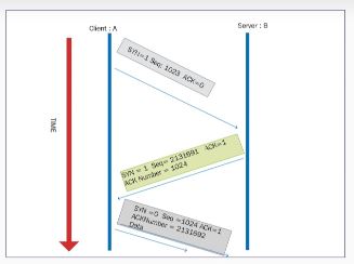 O host inicial envia um pacote com o sinalizador SYN, definido para iniciar uma conexão. O respondente responde com um pacote que tem o SYN e ACK like definidos, e o iniciador envia de volta o pacote ACK para confirmar a solicitação de conexão. Da mesma forma, os sinalizadores FIN-ACK são usados para fechar uma conexão enquanto RST é usado para redefinir uma conexão.