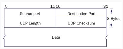 Outro protocolo de camada de transporte importante e amplamente usado é o UDP. É um protocolo de conexão não confiável e é utilizado pelo serviço DNS (ou Domain Name System), SNMP (ou Simple Network Management Protocol) e para streaming de dados em tempo real. Podemos ver sua estrutura de cabeçalho neste diagrama como o protocolo TCP.