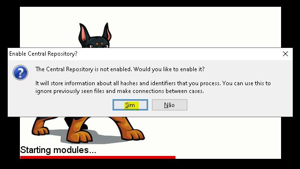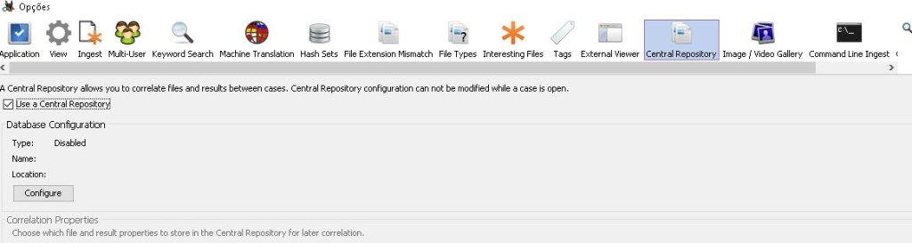 Vamos supor que nosso Autopsy 4 esteja funcionando. O Autopsy 4 quando aberto pela primeira vez mostra uma janela referente ao Central Repository (Repositório Central). Antes de tomar a decisão, vou explicar o que significa.