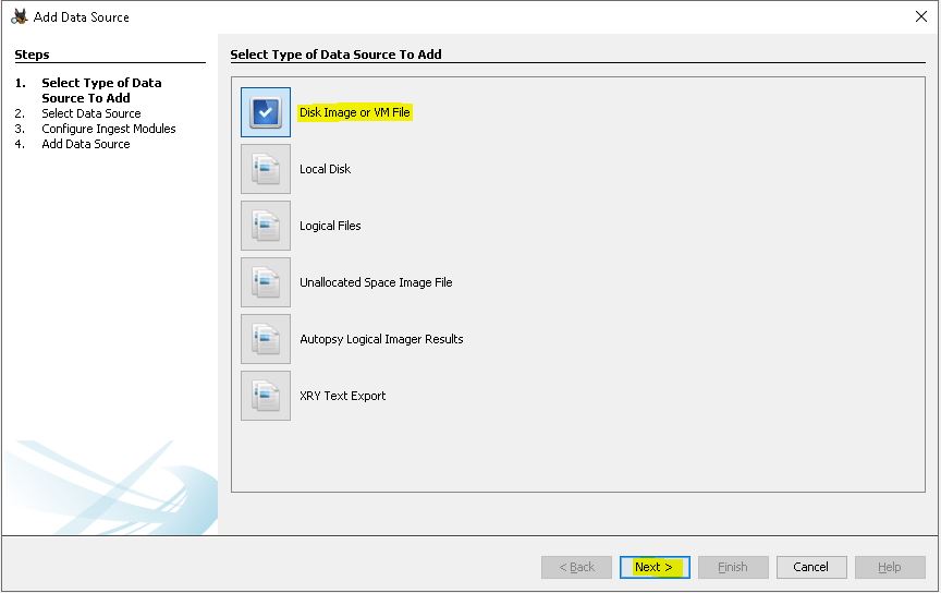 Ao terminar o download, volte ao programa Autopsy e selecione nossa imagem alvo que salvamos anteriormente selecionando Disk Image or VM File depois em Next >.