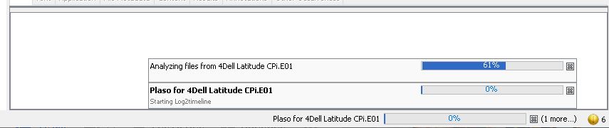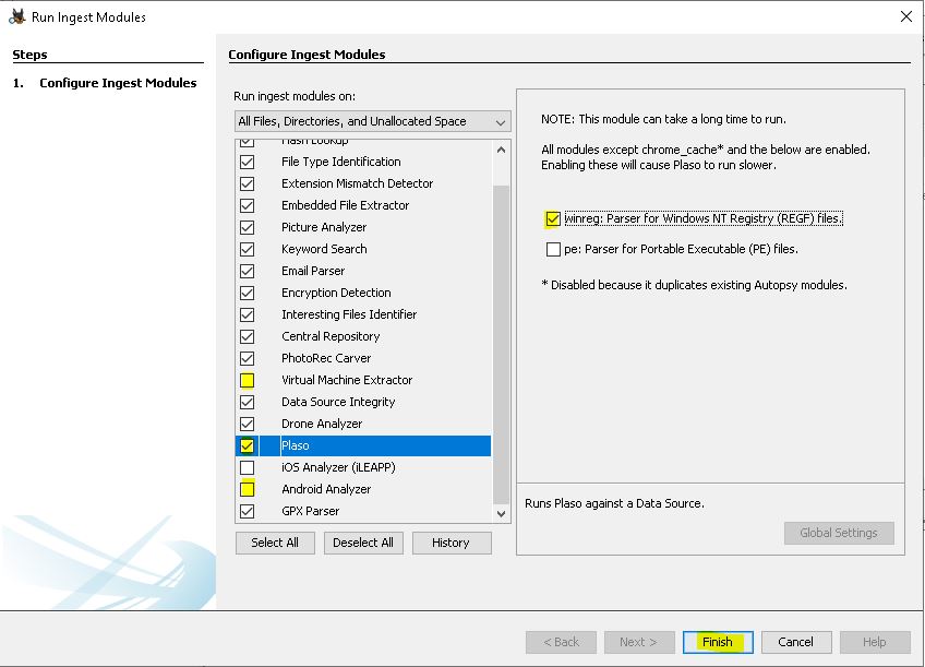 Na próxima etapa, temos que selecionar quais módulos executar para nossa análise. Obviamente, quanto mais módulos usarmos, mais tempo e espaço em disco serão necessários, mas os resultados serão mais precisos e completos. Neste caso, o único módulo que excluímos é o Android Analyzer e o Virtual Machine Extractor. E selecionamos o módulo Plaso, opcionando winreg. Depois clicamos em Next > e Finish para que o Autopsy inicie o trabalho dos módulos mostrando o processo e a barra de status correspondente que está no canto inferior direito.