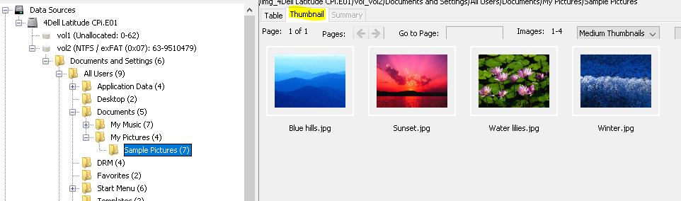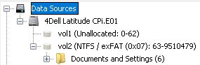 Quando a análise for concluída, podemos navegar na Visualização em árvore ou examinar todos os dados e artefatos extraídos da imagem. As fontes de dados apresentadas são a imagem e as partições em que está dividida:
