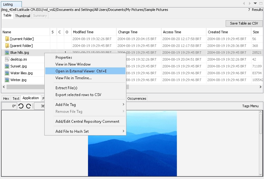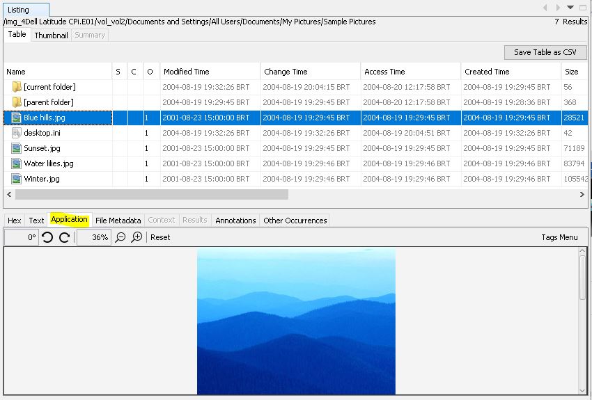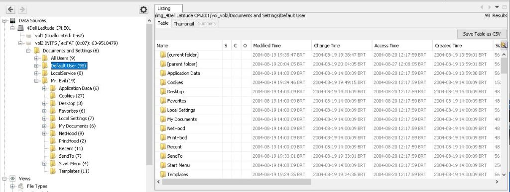 A interface do Autopsy possui um layout intuitivo. Todos os resultados da análise são organizados em uma estrutura de árvore no lado esquerdo da janela. Chama-se de Visualização em Árvore (Tree Viewer).