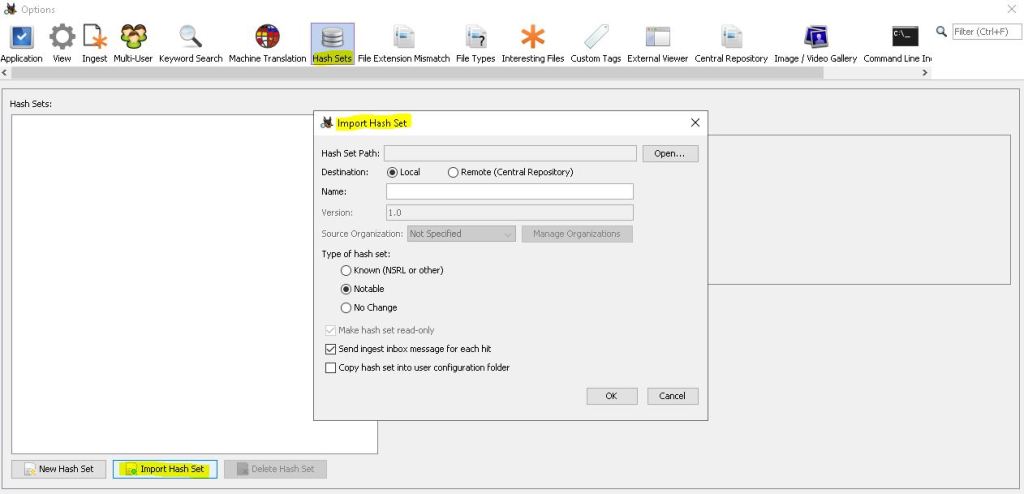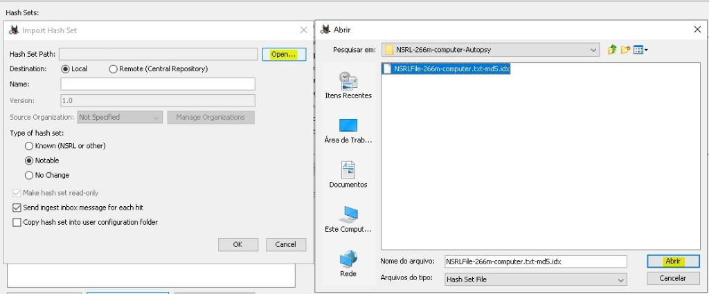 Quando o arquivo for baixado, descompactamos e selecionamos o arquivo index a ser importado. Em Import Hash Set clique em Open… , selecione o arquivo .idx baixado, no diretório, abra o arquivo, e clique em OK na caixa de diálogo do Import Hash Set e OK em Options .