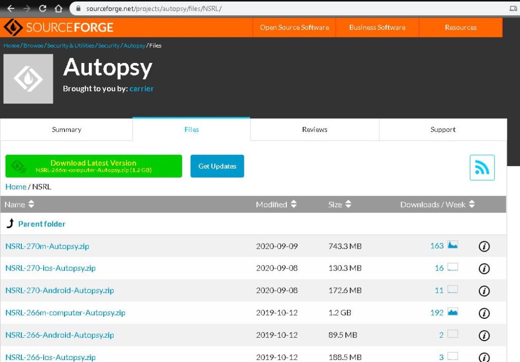 Em vez de importar todo o banco de dados NSRL, podemos importar um índice pré-fabricado que pode ser baixado da página do projeto Autopsy no endereço eletrônico https://sourceforge.net/projects/autopsy/files/NSRL/ clicando no link Download Latest Version. O download do arquivo é bem grande.