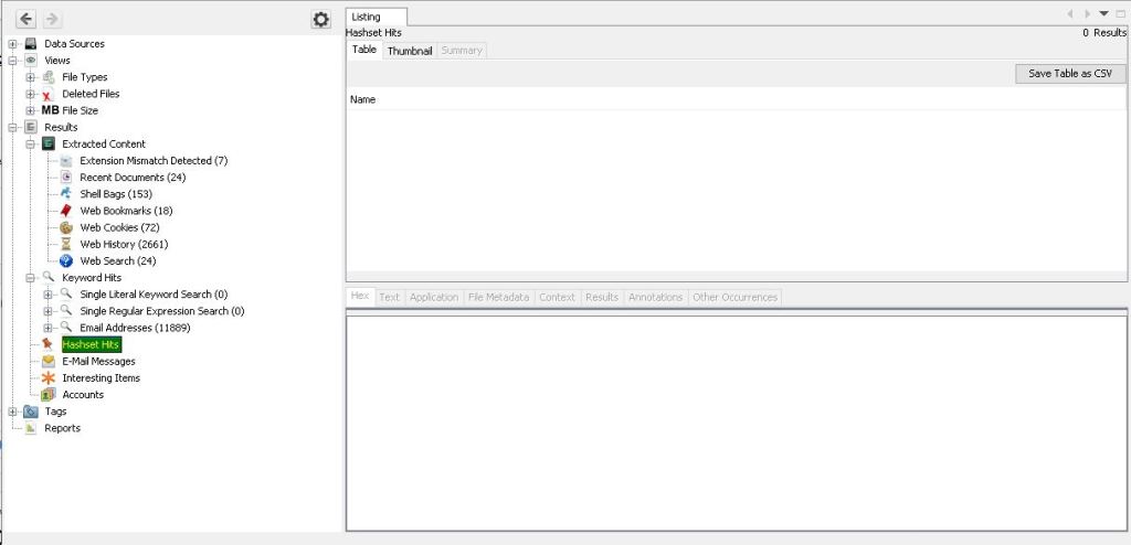 Os resultados do banco de dados hash aparecem em um módulo que pode ser visto no visualizador em árvore na guia de ocorrências do Hashset (Hashset Hits). Nesse exemplo não há ocorrências.