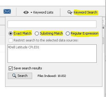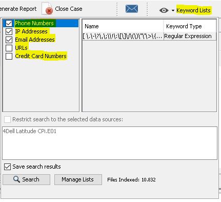 Ao clicar na lista de palavras-chave (Keyword List), também podemos pesquisar usando palavras-chave integradas que são expressões regulares que identificam números de telefone, endereços IP, e-mail e URLs, até mesmo números de cartão de crédito. O uso dessas listas internas pode produzir um grande número de resultados.