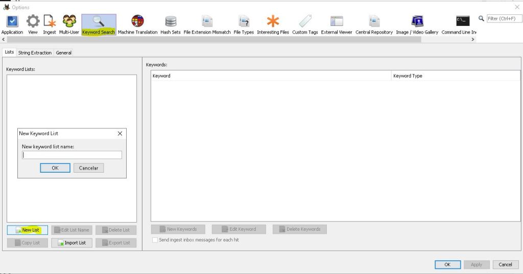 A lista de palavras-chave (Keyword Lists)também pode ser especificada no menu Tools → Options e, em seguida, na configuração do módulo Pesquisa por palavra-chave (Keyword Search), onde podemos adicionar novas listas.