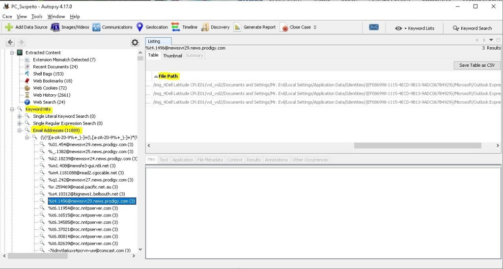 Por exemplo, podemos ver uma lista de todos os endereços de e-mail e para cada endereço o arquivo, também onde o arquivo foi encontrado.