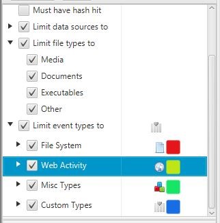 As contagens mostram um gráfico de barras empilhadas e exibe a quantidade de eventos de um determinado tipo que ocorreram em um determinado período, mas não mostra eventos específicos. Por exemplo, os eventos relacionados ao sistema de arquivos são exibidos em vermelho, enquanto os relacionados à atividade na web são exibidos em verde. Podemos filtrar eventos com base em seus tipos e subtipos, mostrando apenas aqueles que são exibidos e apenas aqueles que nos interessam. Os eventos também podem ser filtrados com base em uma string, também outras opções.