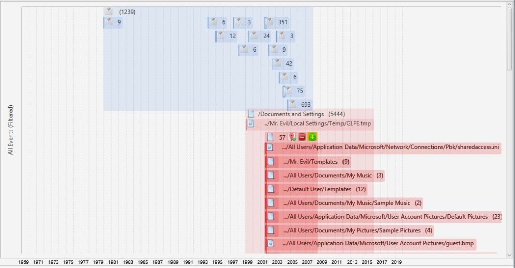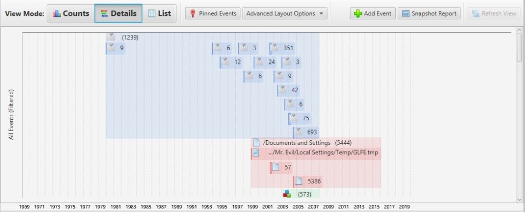 Um recurso importante que foi introduzido com a versão 3 e significativamente aprimorado com a versão 4 é a análise e visualização da linha do tempo (Timeline Analysis and Visualization). Este recurso inclui todos os resultados do Autopsy que aparecem no Visualizador em árvore com os carimbos de data/hora (timestamps) associados. Cada evento possui um tipo de carimbo de data/hora e uma descrição. Para gerar uma linha do tempo, clicamos no botão Timeline e o processo leva vários minutos para ser concluído. Após a conclusão do processo, uma segunda janela é aberta, como podemos ver na janela da linha do tempo.