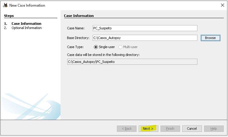 Outra janela de diálogo é exibida. Podemos inserir informações sobre o nome do caso, por exemplo, PC_Suspeito e o diretório base onde queremos salvar os arquivos relativos ao caso. No tipo de caso permaneça com Single-user. Em seguida, clique em Next.