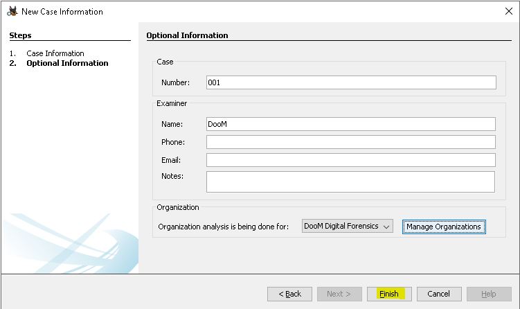 Podemos inserir outras informações opcionais como o número do caso e o examinador. Depois de preenchido (se quiser preencher) ou não, clique em Finish para dar andamento a criação do caso.