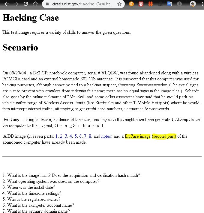 Uma vez que o caso é criado, temos que selecionar a fonte de dados que em nosso caso é um arquivo de imagem. Podemos baixar uma imagem de amostra do Hacking Case Scenario dos conjuntos de dados do NIST Computer Forensic Reference deste endereço: https://www.cfreds.nist.gov/Hacking_Case.html . Lidaremos com o formato de imagem EnCase dividido em dois arquivos.